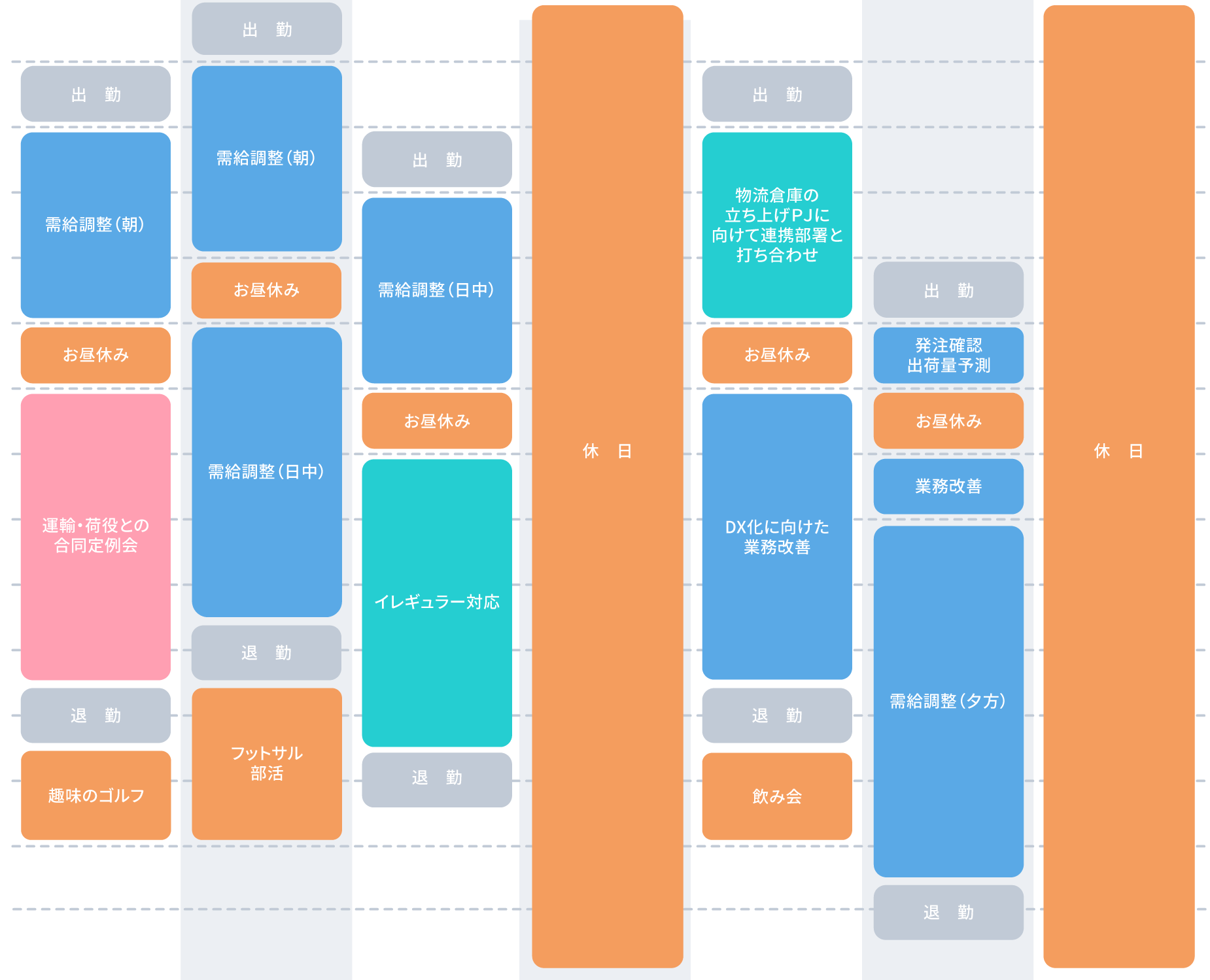 私が勤務している市乳センターは、工場で製造された牛乳や乳製品の在庫を管理し、品質を維持したままスーパーやコンビニ等に商品を滞りなく届けるための調整を担う部署です。そのなかで需給担当として、生産から配送まで一連の工程を円滑に進める司令塔のような役割を担っています。具体的には発注量に加え、特売予定や天候などを考慮し、全国の営業部門や工場と連携しながら商品の製造計画を立てます。そして、配送状況をリアルタイムで確認し、トラブルが発生した際には迅速かつ的確な対応を行います。