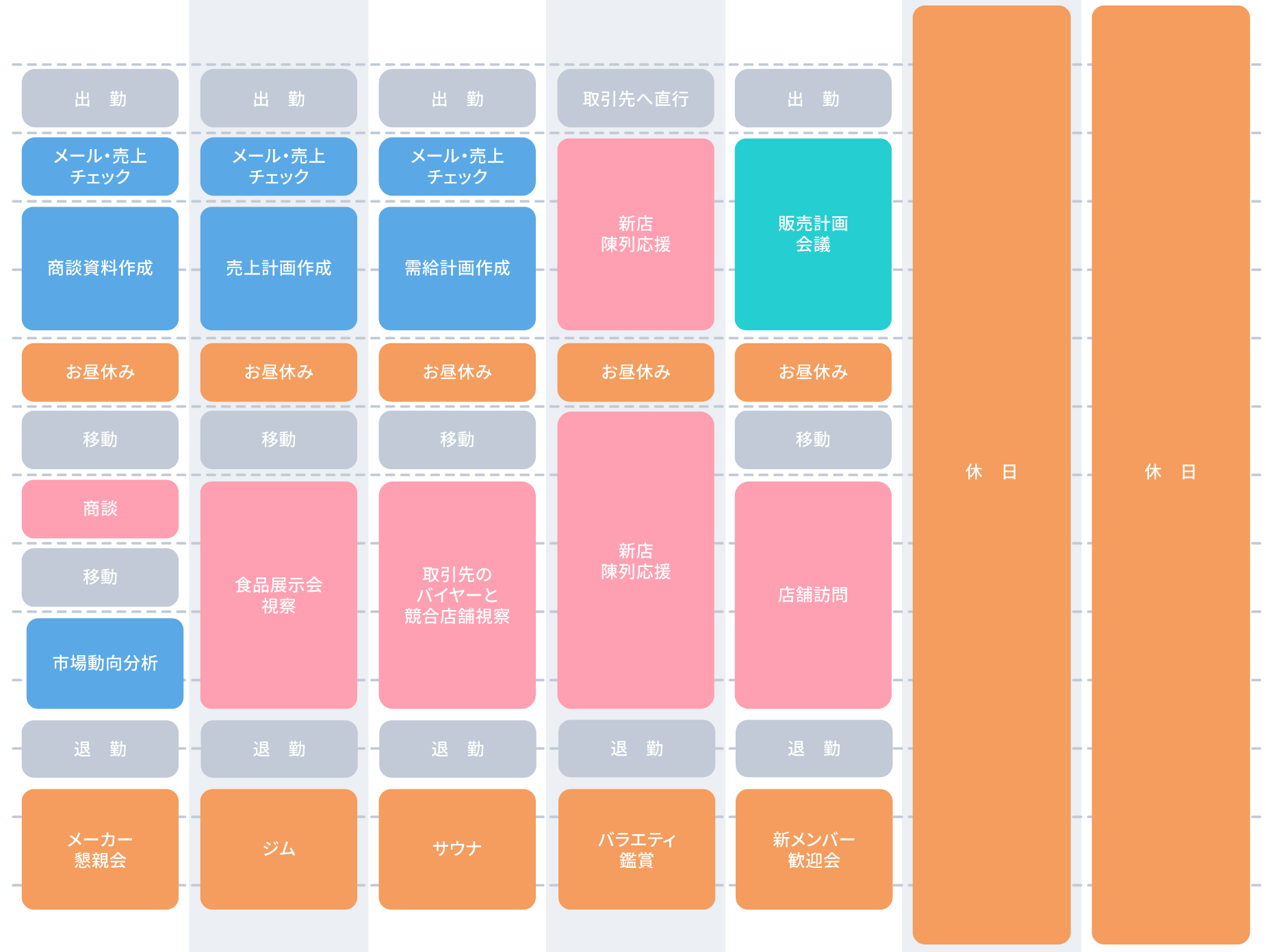私は家庭用商品の営業として、関東エリアのスーパーマーケットを担当しています。主な業務としては、取引先に対して販売計画の提案と、販売促進に向けた売場づくりの支援や商品紹介が挙げられます。