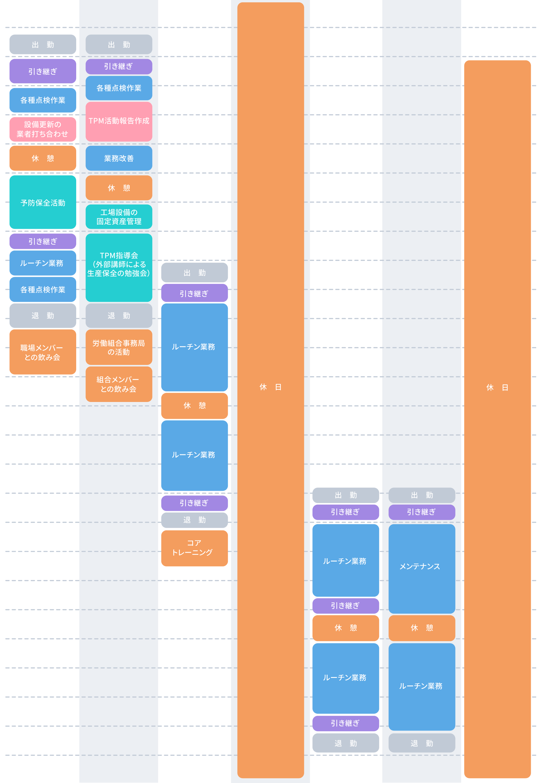 仕事内容だけを見ると、ルーチンワーク中心のように思われるかもしれませんが、実際は主体的な行動が求められる業務がほとんどです。工場の生産状況を常に確認しながら、小さな異変にも素早く気づき、適切に対応することが求められます。また、品質向上やコスト削減を実現するためには、自ら課題や問題点を洗い出し、その原因を明らかにして、どうすれば改善・解決できるのかを考え、行動に移す姿勢が不可欠です。